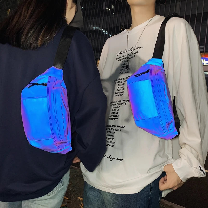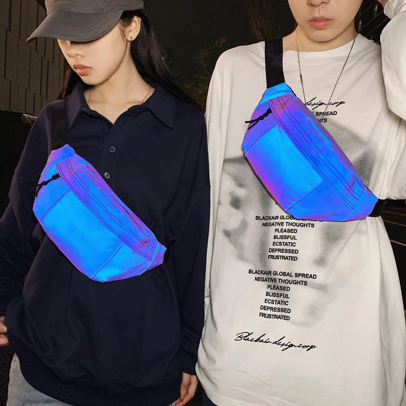 This waist bag is designed for both men and women, made of waterproof nylon material. It features a large capacity, perfect for travel. The reflection belt adds safety during low-light conditions.