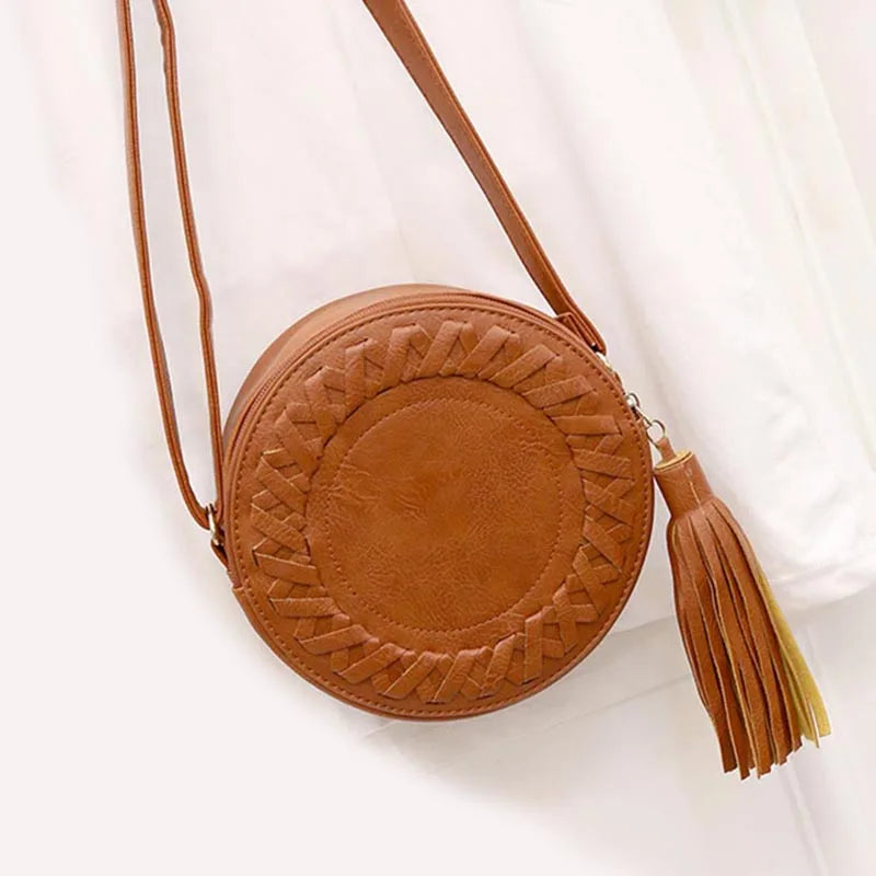 This stylish bag is perfect for women and girls. Made of high-quality PU leather, it features a small tassel detail and a vintage round shape. Ideal for the beach or everyday use.