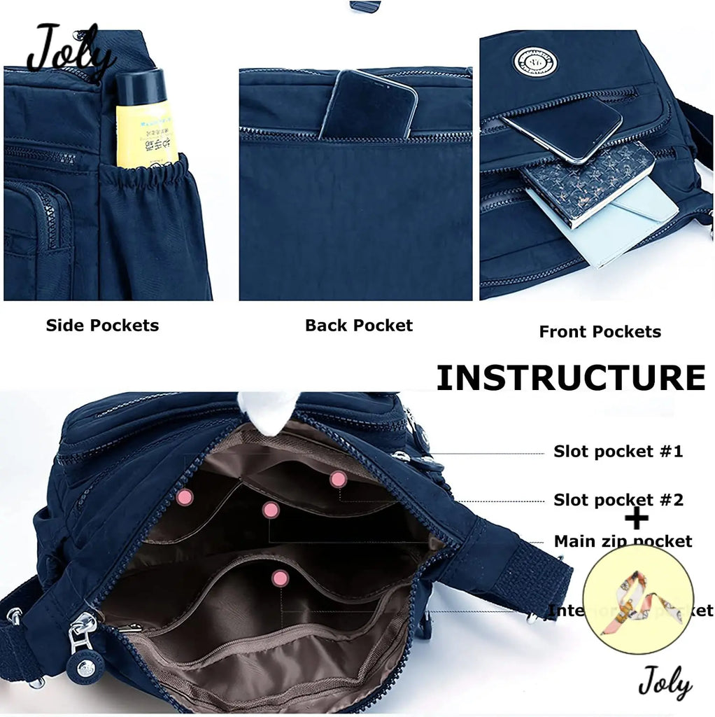 This multi-pocket crossbody bag is made of waterproof nylon, ideal for daily use. It features a practical design for organizing your essentials on the go.