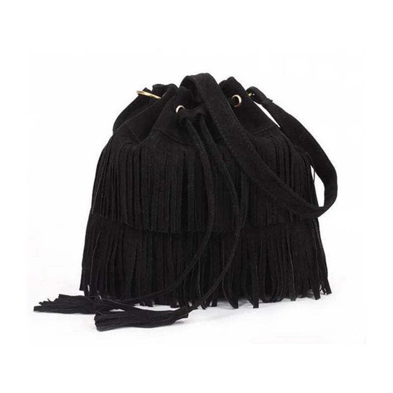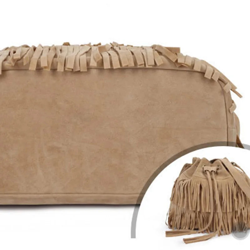 Ausuky Vintage Fringe Tassel Shoulder Bag Women Faux Drawstring Bucket Bag