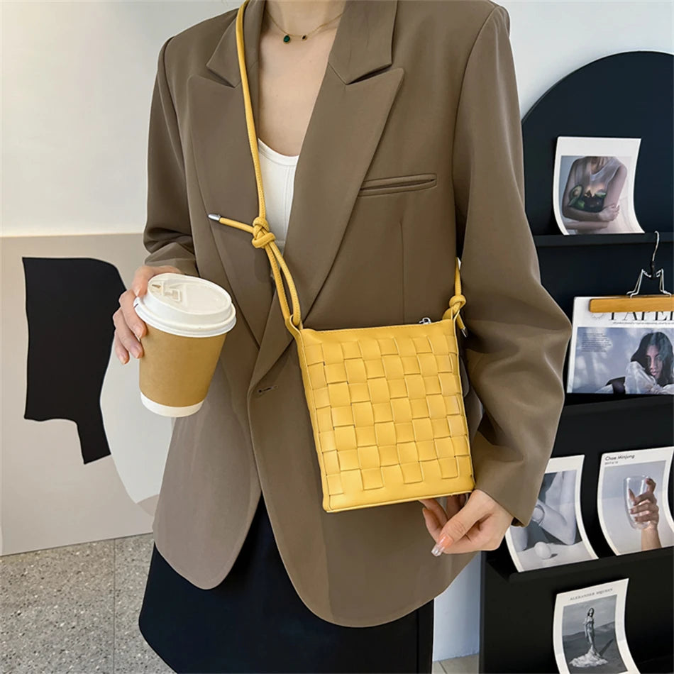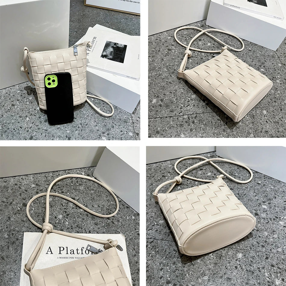 Stay stylish with this small bucket bag made of high-quality weave PU leather. Perfect for carrying your essentials on the go.