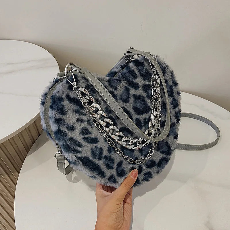 Stay trendy this autumn with this stylish plush love shape box bag in leopard print. Perfect for carrying your essentials in style.