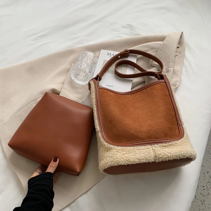 Autumn Winter Women's Lamb Wool Handbags Bucket Shoulder And Clutches Bag