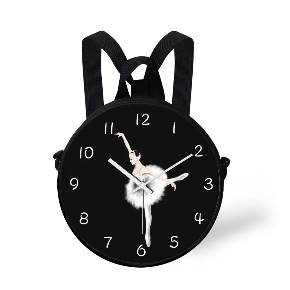 Stylish round clock backpack with customizable ballet dancer print, perfect for girls and women. This circle crossbody bag is ideal for carrying essentials with a touch of elegance.