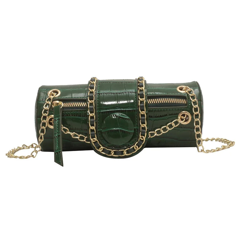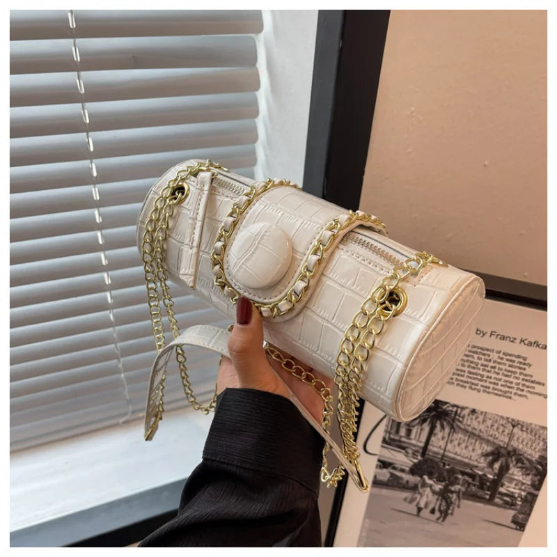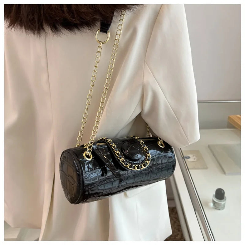 This small chain barrel-shaped bag made of PU leather is perfect for women. It can be used as a handbag or shoulder bag.