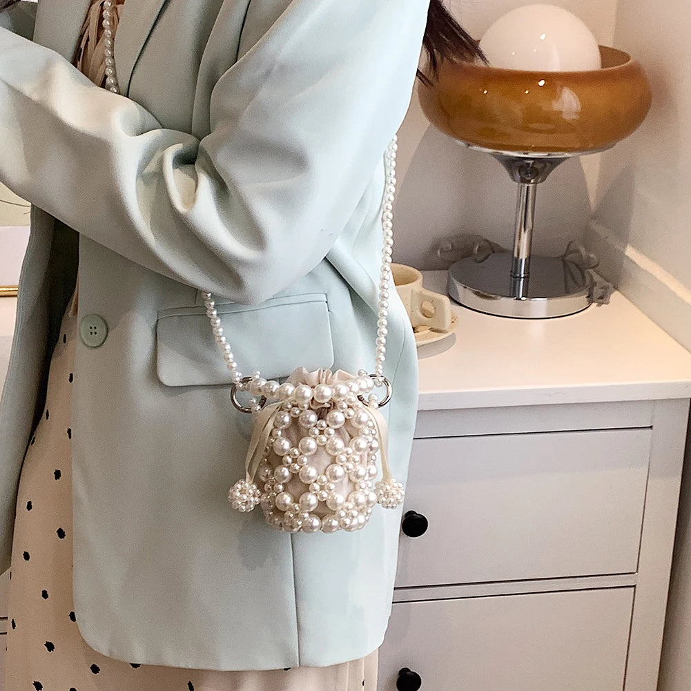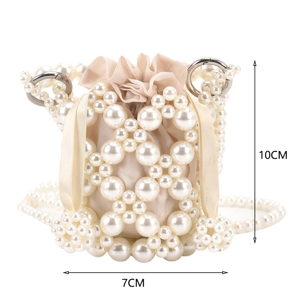 Beaded Pearls Shoulder Bag for Women Clutches Bucket Drawstring Messenger Handba