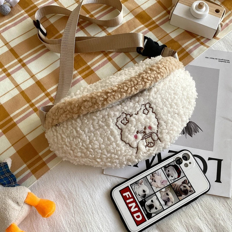 Bear Embroidered Plush Waist Bag Women Soft Warm Fanny Pack