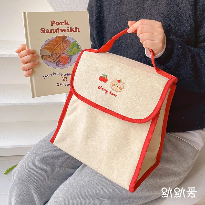 Bear Embroidery Thermal Lunch Bag Large Capacity Women Handbag