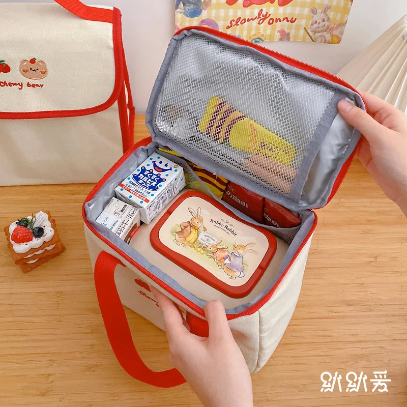 This lunch bag features a cute bear embroidery design and is perfect for storing food. It has a large capacity and is ideal for students. The thermal insulation helps keep your food fresh and warm.