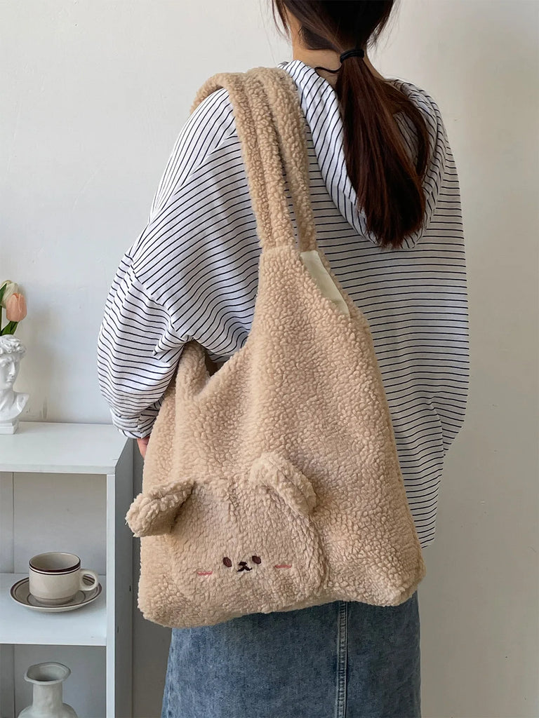Bear Women's Faux Lamb Wool Shoulder Bag Plush Tote Purse Handbag