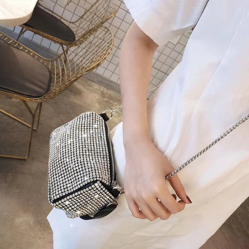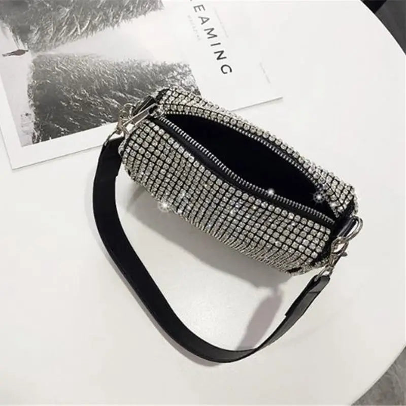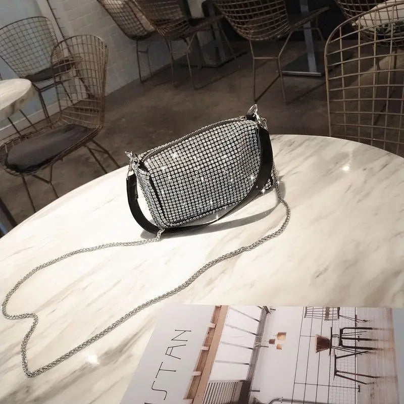 This elegant evening clutch bag features bling diamonds, perfect for dinner parties or special occasions. It can be used as a shoulder bag or a small handbag.