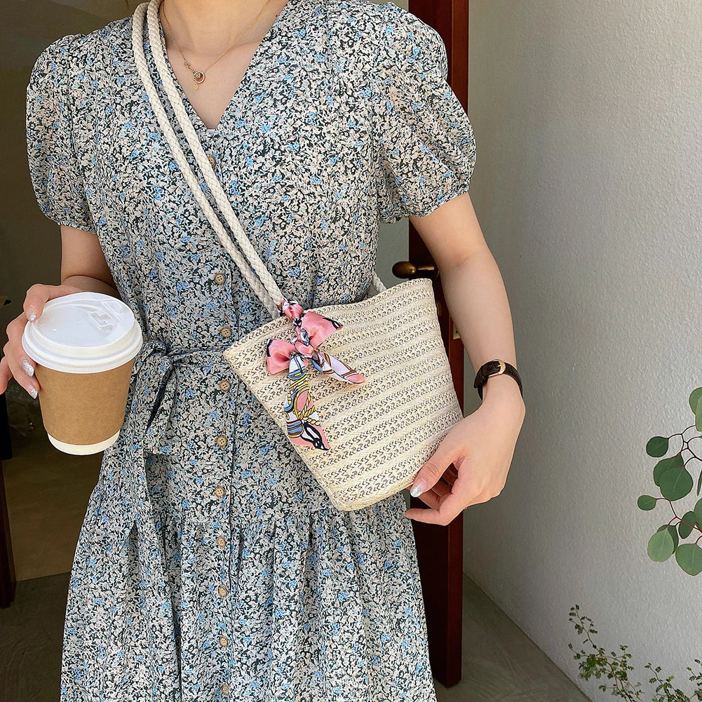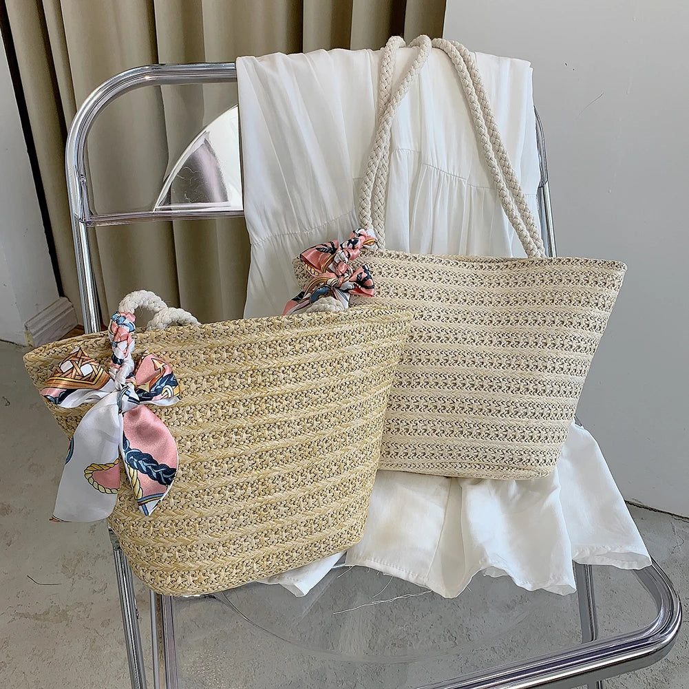 Elevate your summer style with this straw shoulder bag featuring a woven design and a silk scarf. Perfect for beach outings and casual occasions.