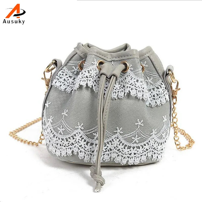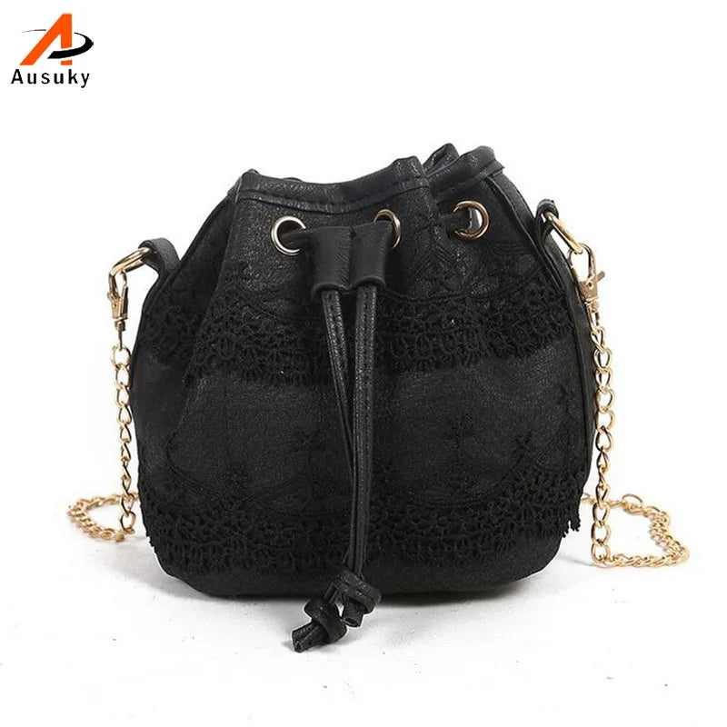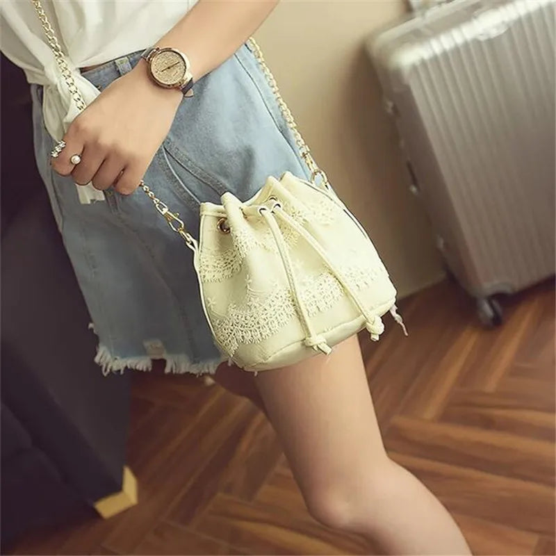 Bohemia Style Lady Lace Drawstring Bucket Bag Chain Shoulder Crossbody Bag