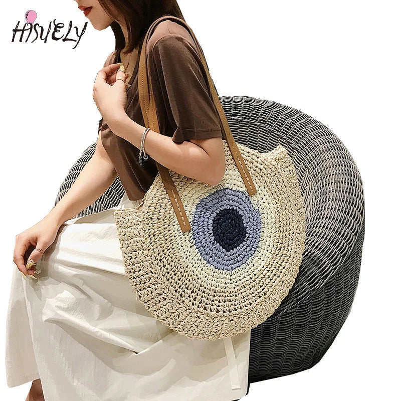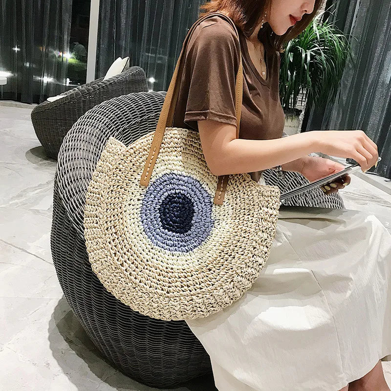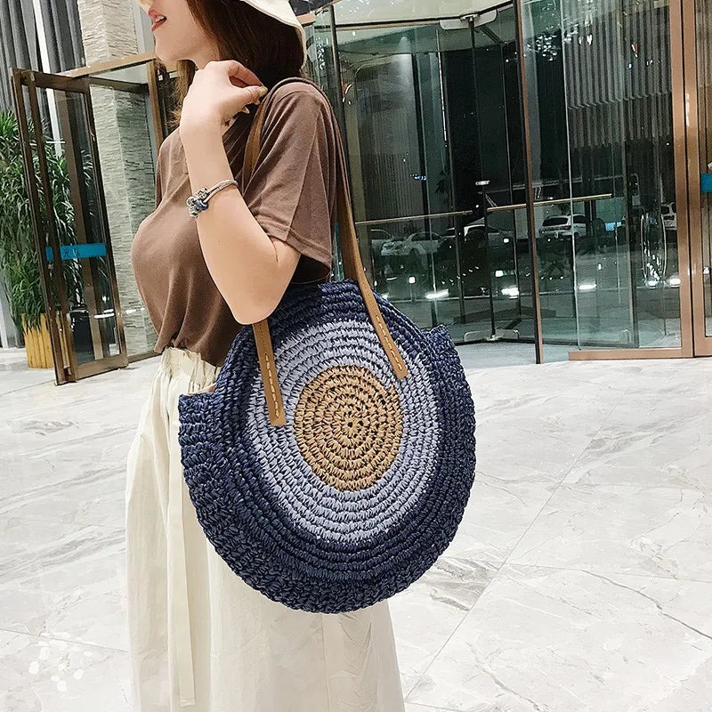 Elevate your summer style with this Bohemia women round handbag. Made of rattan woven knitted straw, it offers a large capacity tote with leather shoulder straps.