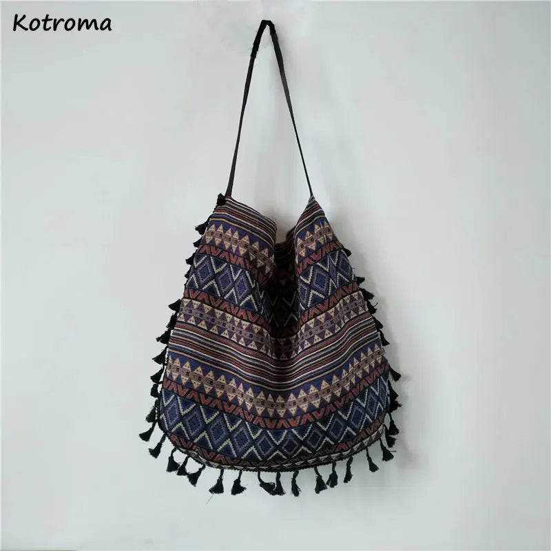 This Bohemian vintage shoulder bag is perfect for shopping or everyday use. It features tassel details and a comfortable underarm design.