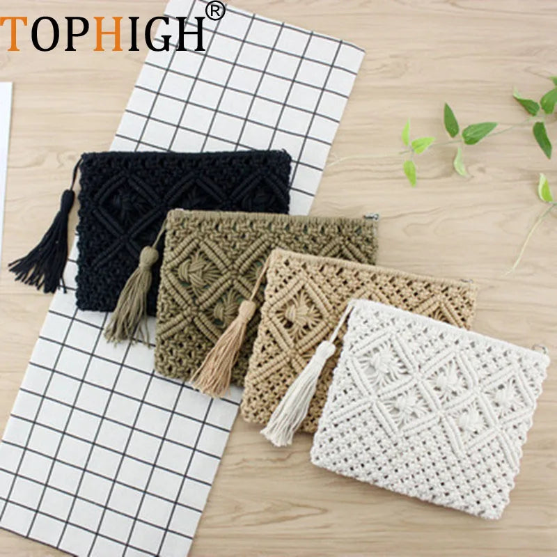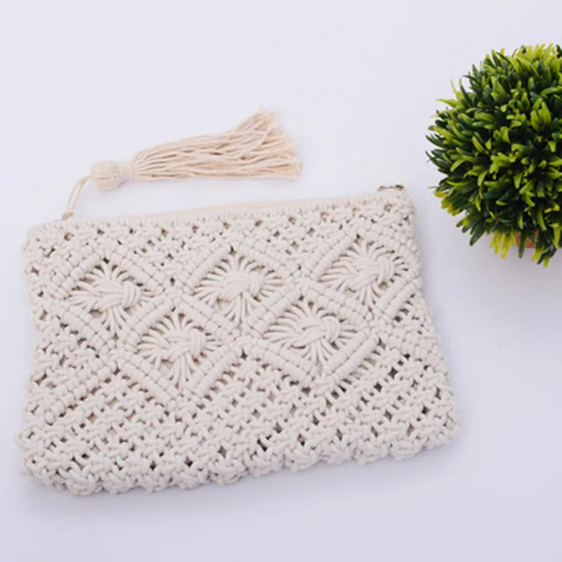 Elevate your summer style with this boho chic woven tassel beach bag. Perfect for a day at the beach or a casual outing, this clutch adds a touch of charm to your look.