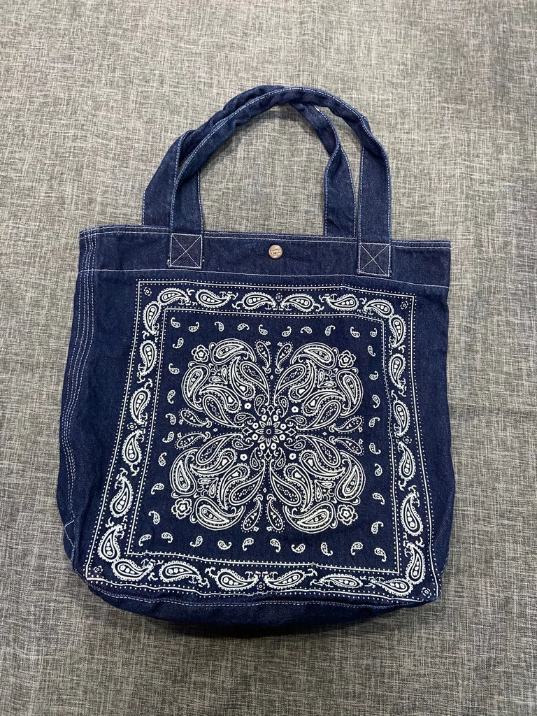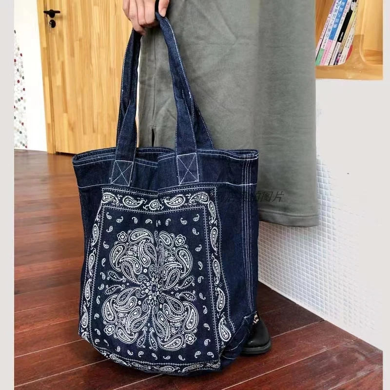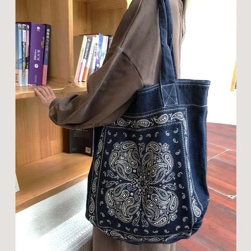 Boho Denim Shoulder Bag Cashew Flower Print Casual Handbag Women Large