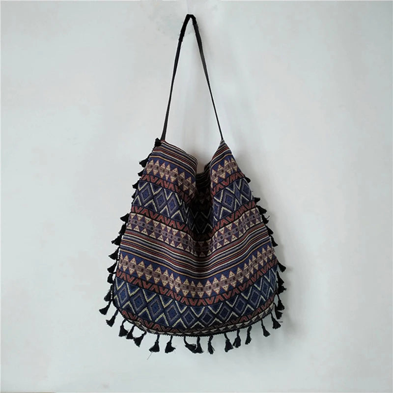 Vintage bohemian shoulder bag with tassel detail. Nation style design with fringed stripes. Large capacity for all your essentials.