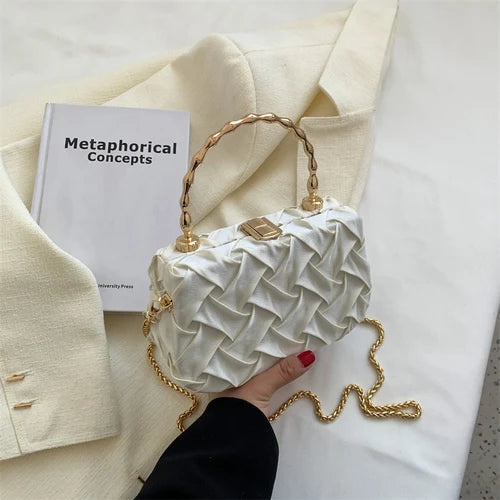 Braided Fabric Small Shoulder Box Bag Metal Handle Crossbody Handbag Tote