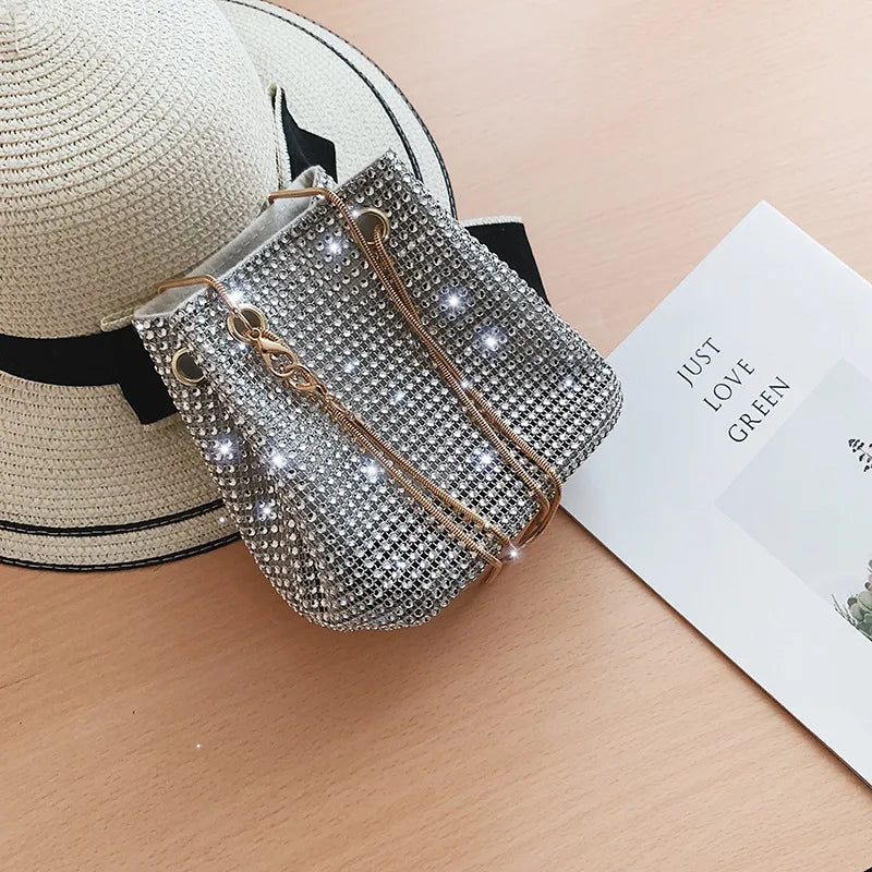 Stay stylish with this bucket bag featuring a bright diamond chain design. Perfect for spring and summer, this open messenger bag is a must-have accessory.