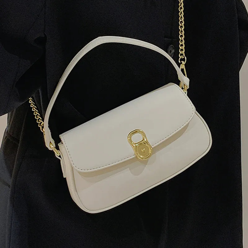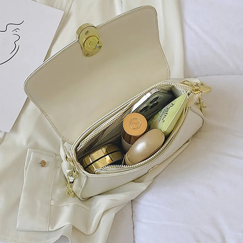 Brown Leather Crossbody Bag with Metal Chain - Casual Flap Handbag