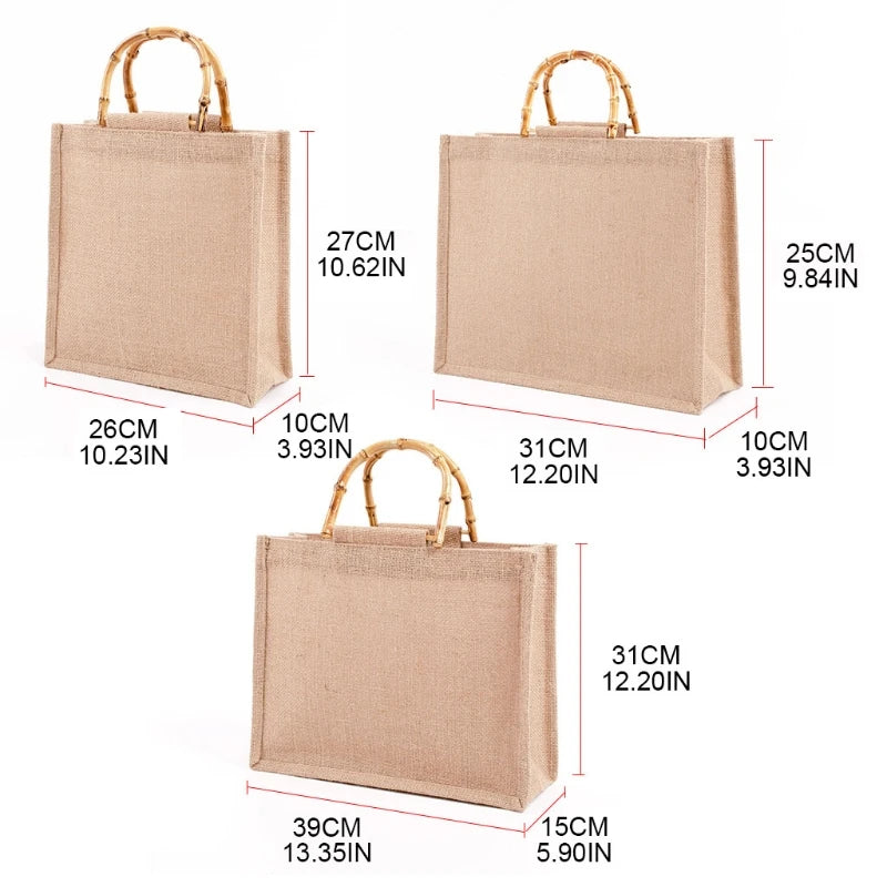 Burlap Jute Shopping Bag Bamboo Loop Handles Tote Grocery Bags