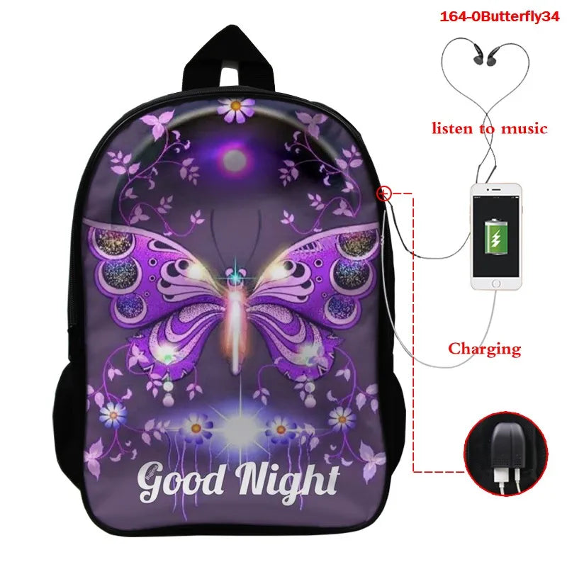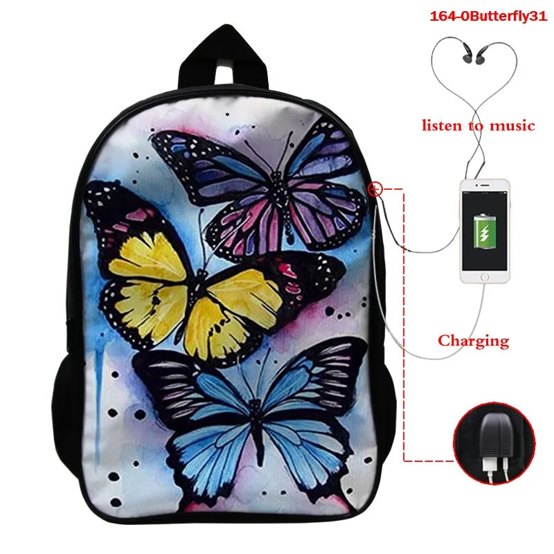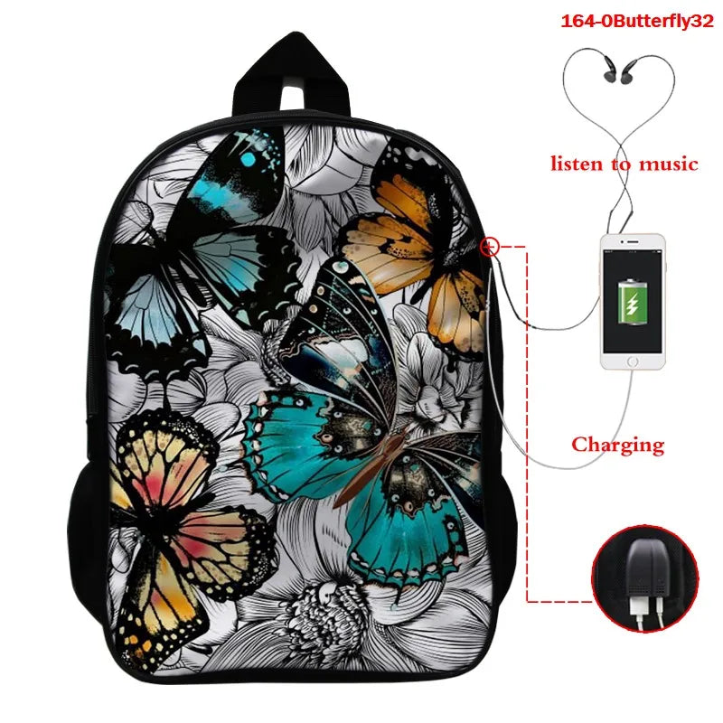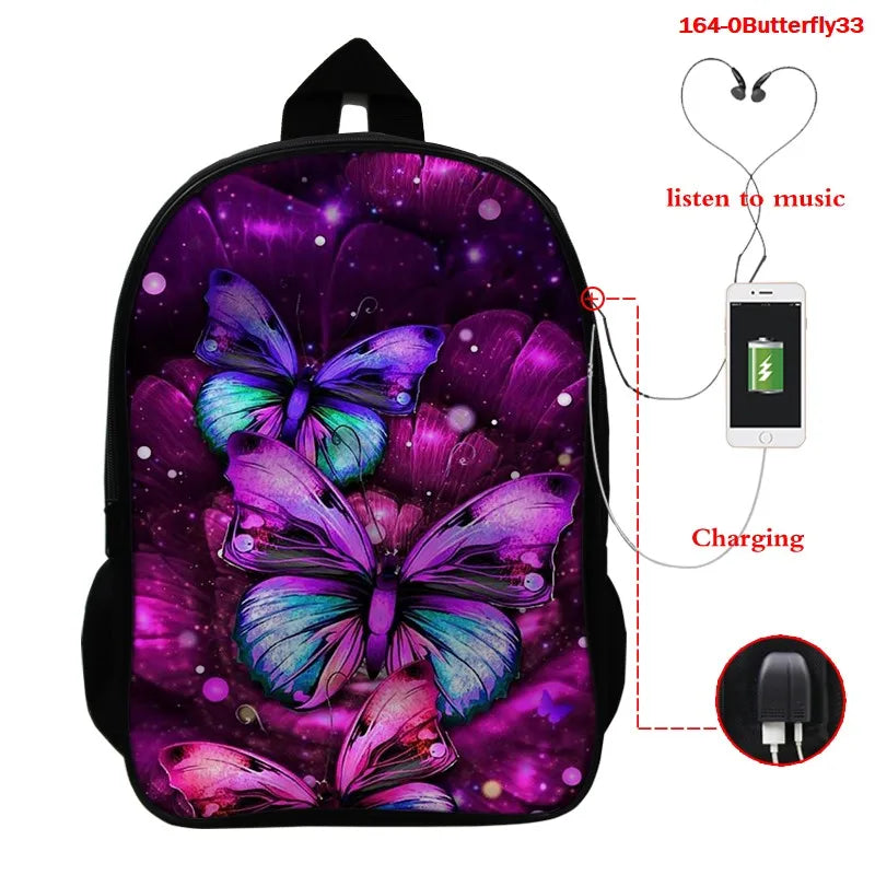 This 16 inch school bag features a 3D butterfly print design and USB charging port. Suitable for women, boys, and girls.