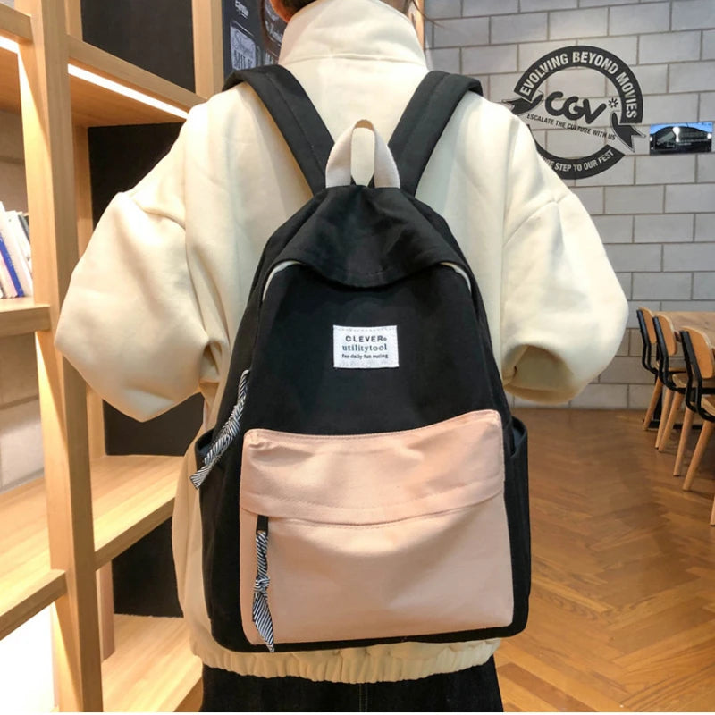 Canvas Backpack Women Shoulder Bag Stitching School Bag Teenage Girl Children