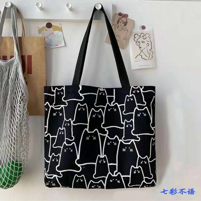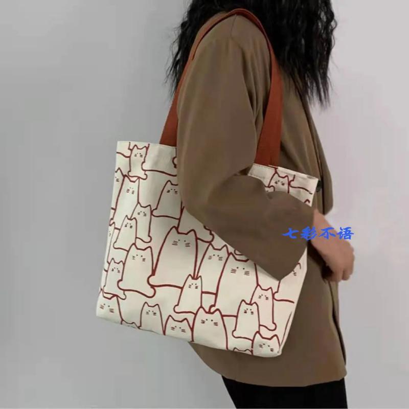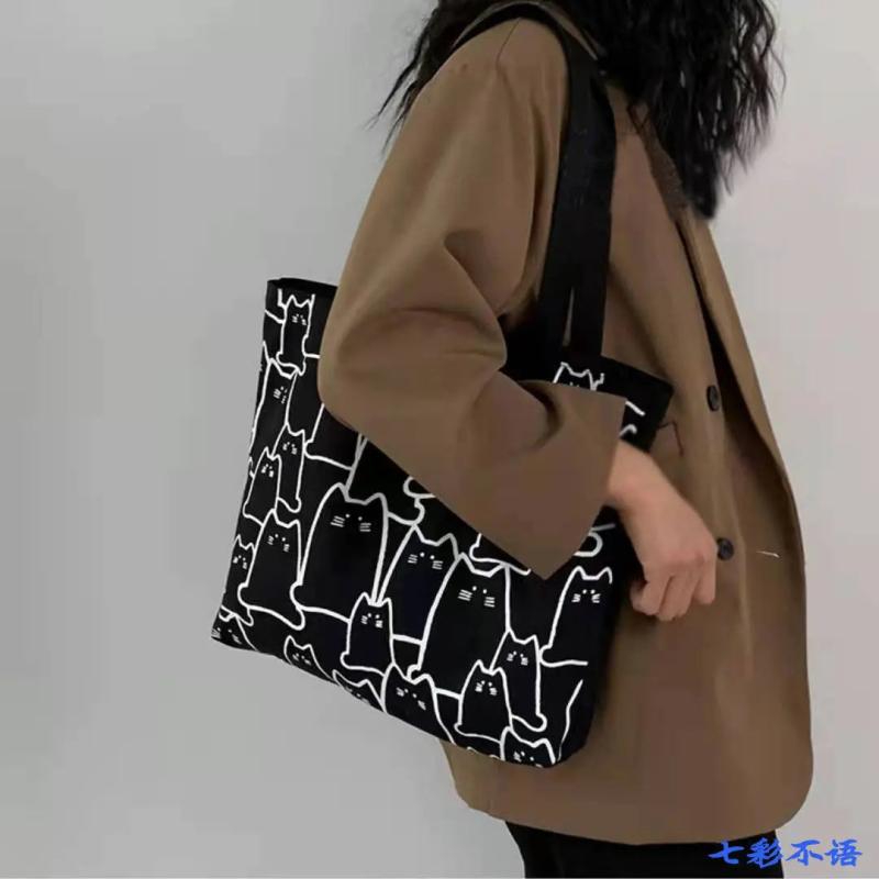 Stay stylish and organized with this large capacity canvas shopper bag featuring a cute cat design. Comes with a secure zipper closure.