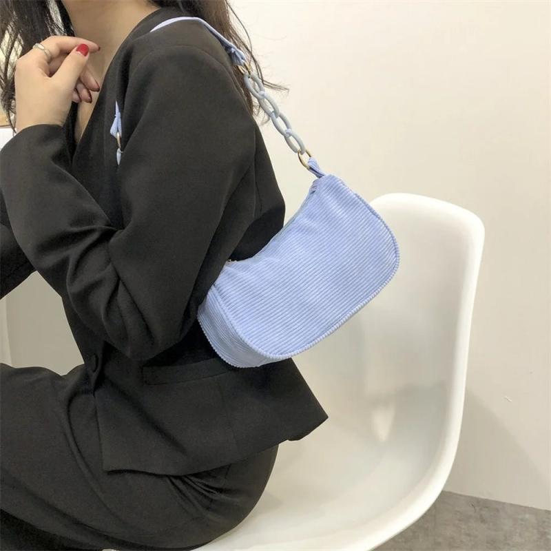 This stylish canvas handbag features a chain strap and corduroy material. It's perfect for carrying your essentials in a fashionable way.
