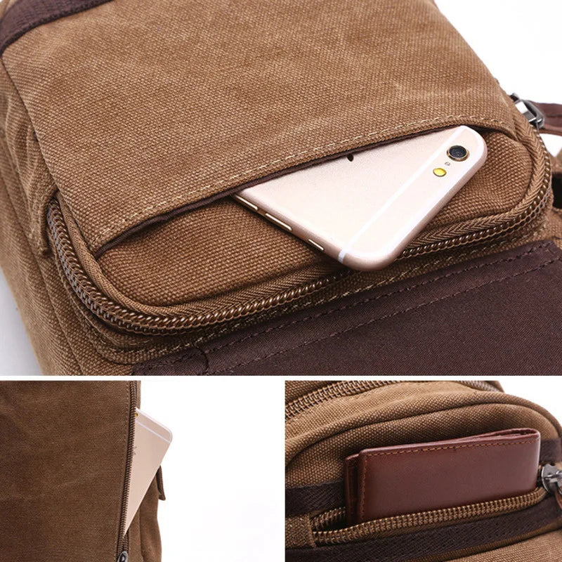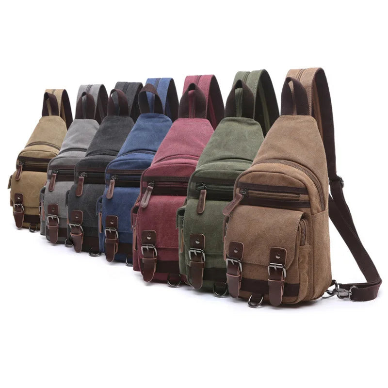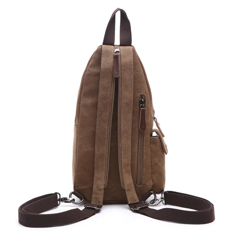 This canvas chest bag is a perfect vintage accessory for both men and women. Ideal for travel or daily use.