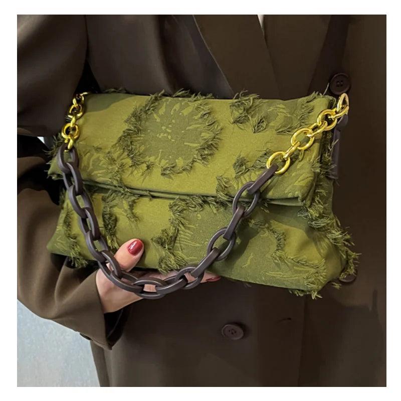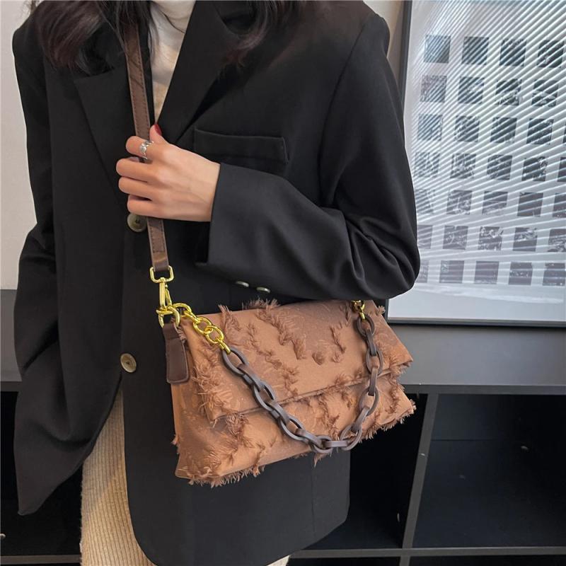 This versatile clutch purse is perfect for everyday use as a crossbody or shoulder bag. It features a stylish chain strap and is made of durable canvas material.
