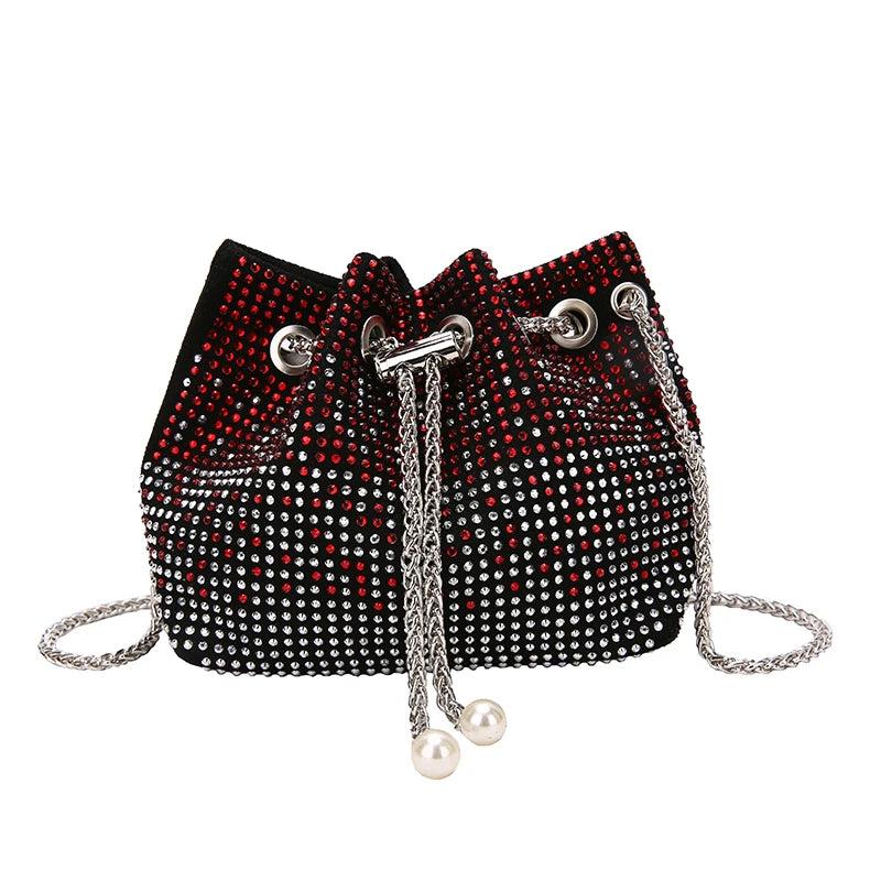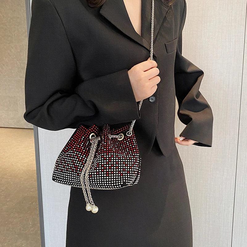 This versatile clutch bag features a drawstring closure, long metal chain strap, and can be worn as a crossbody shoulder bag. Perfect for evening outings and events, this mini bag is stylish and functional.