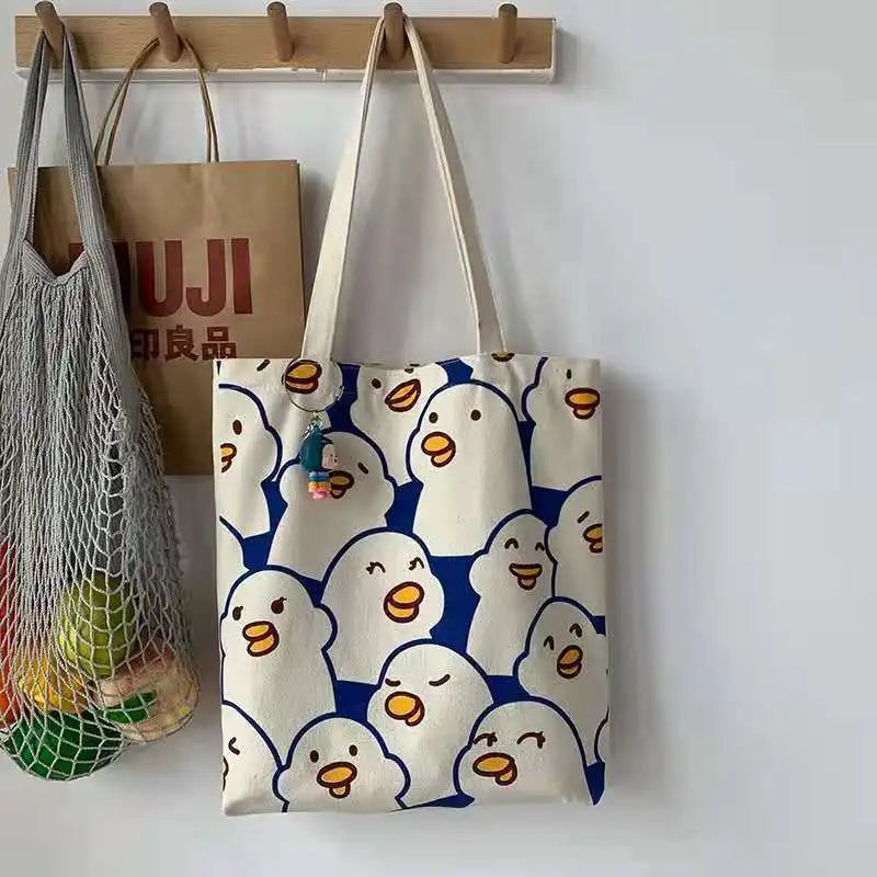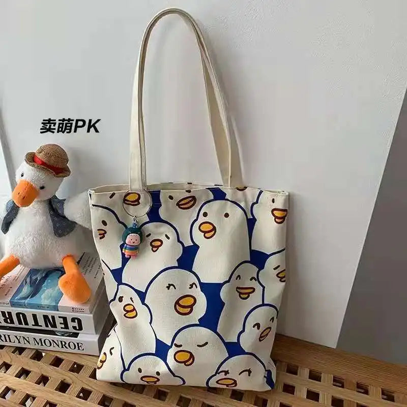 Canvas Duck Tote Bag with Zipper Japanese Style Cartoon Small Shoulder Bag