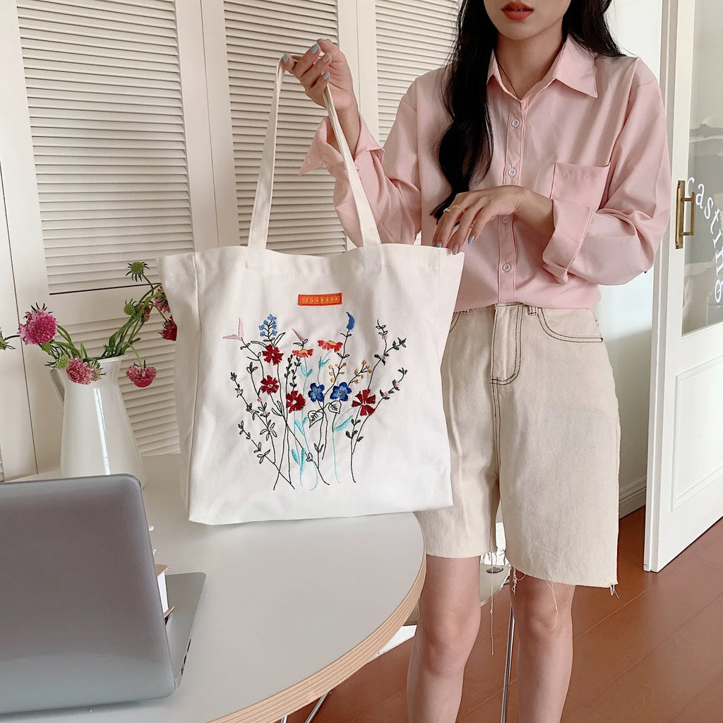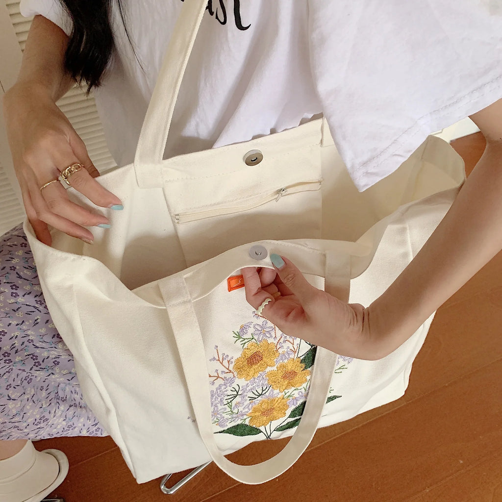 Canvas Floral Shoulder Bag Large Capacity Shopping Bag for Women
