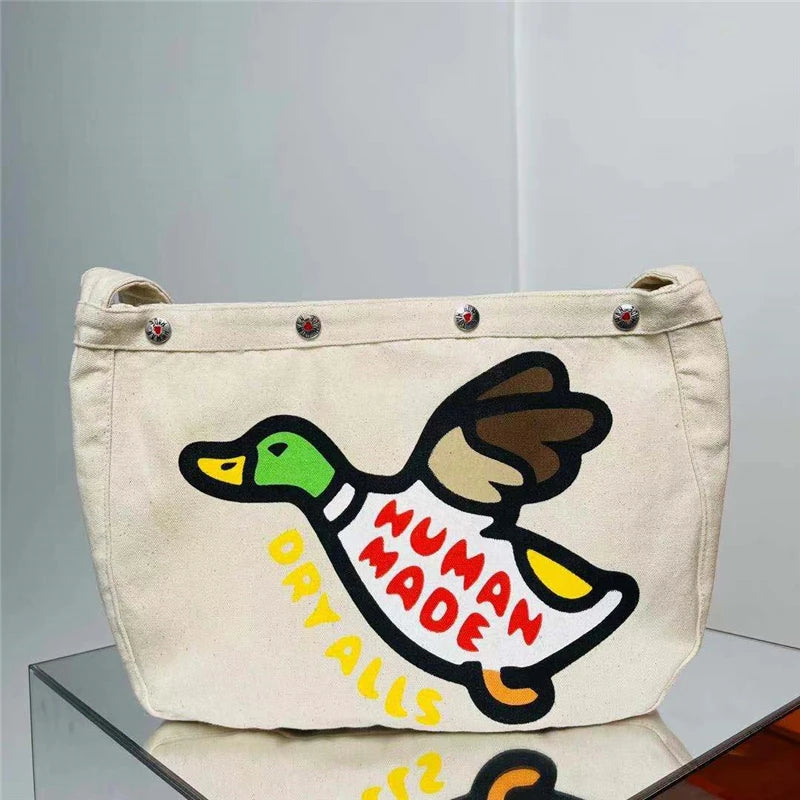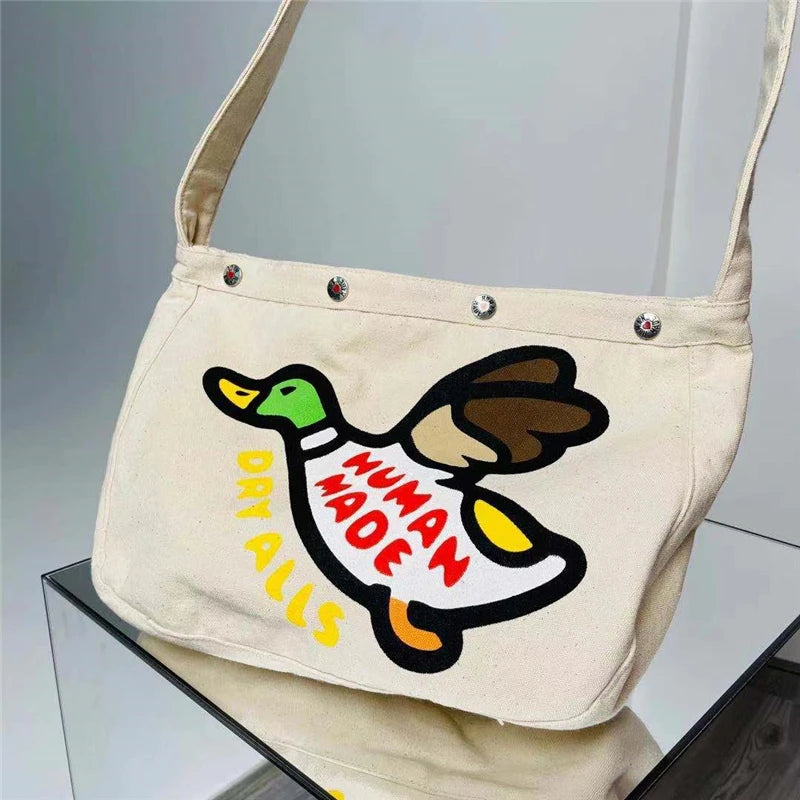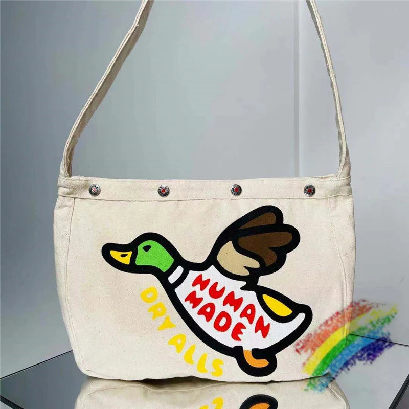 This canvas messenger bag is perfect for men and women. It features a flying duck design and is ideal for casual use.