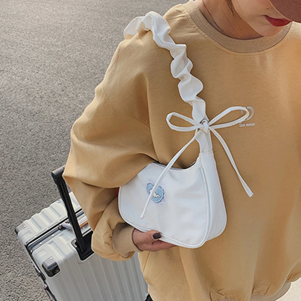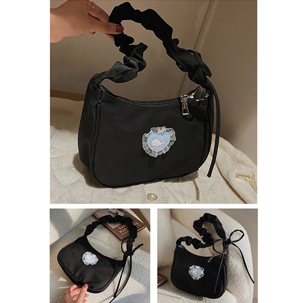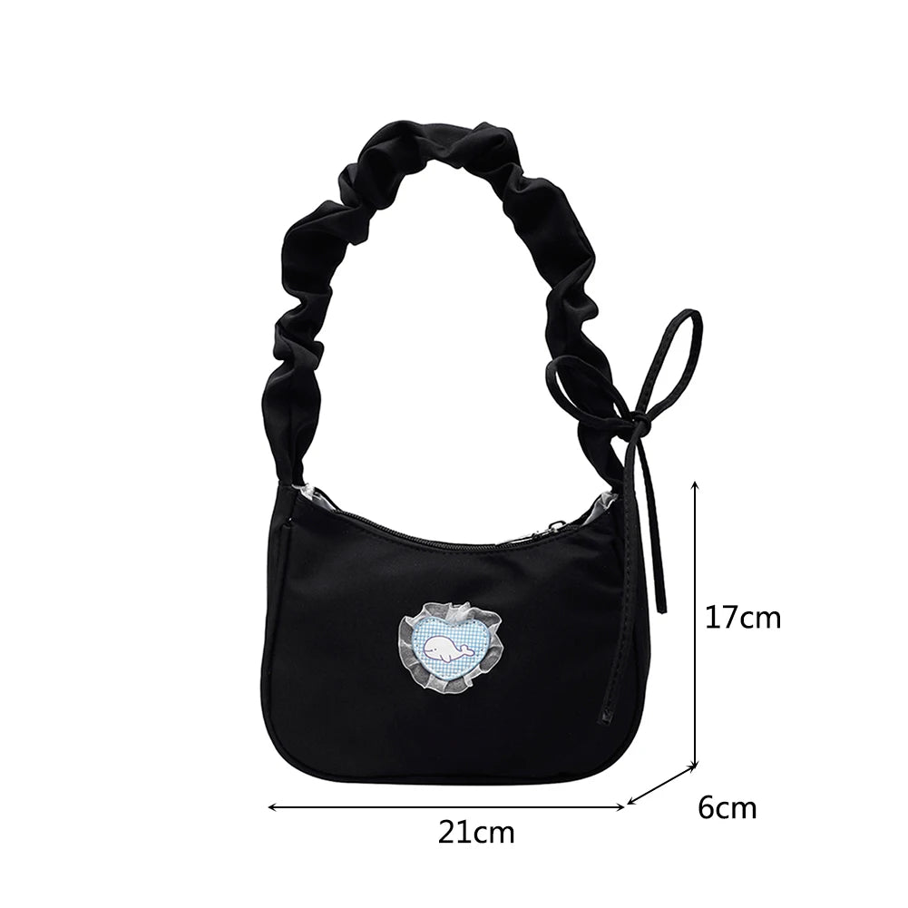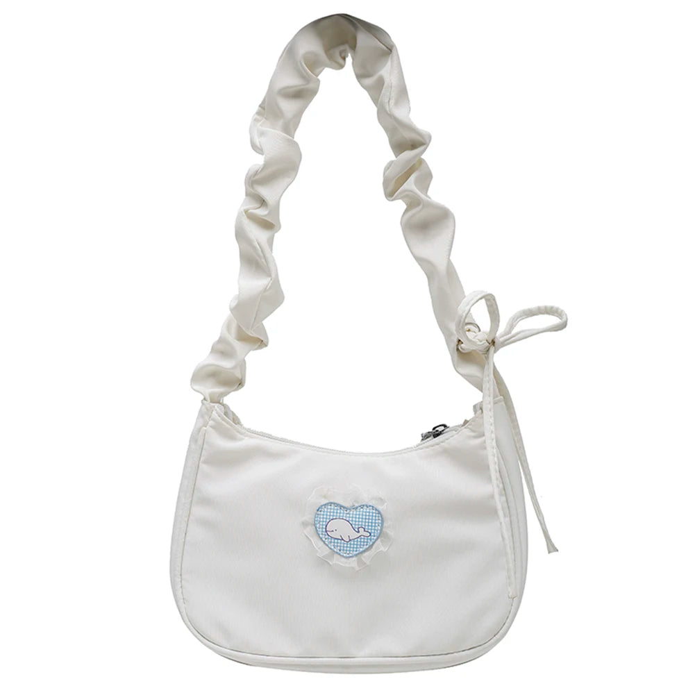 Stay stylish with this fashionable canvas shoulder bag featuring a heart pattern print. Perfect for casual outings, this bag has a zipper closure and a unique dumpling shape.