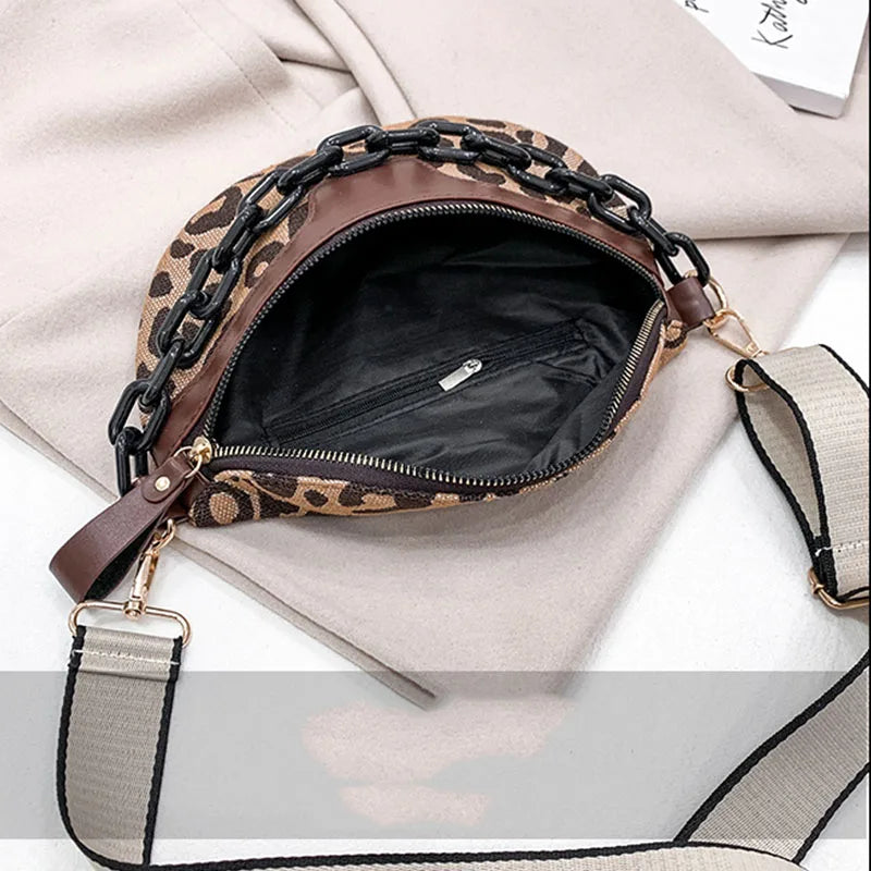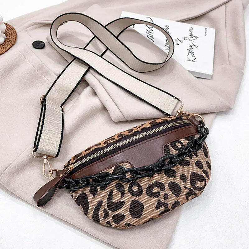 This waist bag is perfect for women on-the-go, featuring a stylish chain design and made of durable canvas material. It can be worn as a crossbody or chest bag for added versatility.