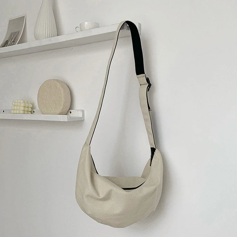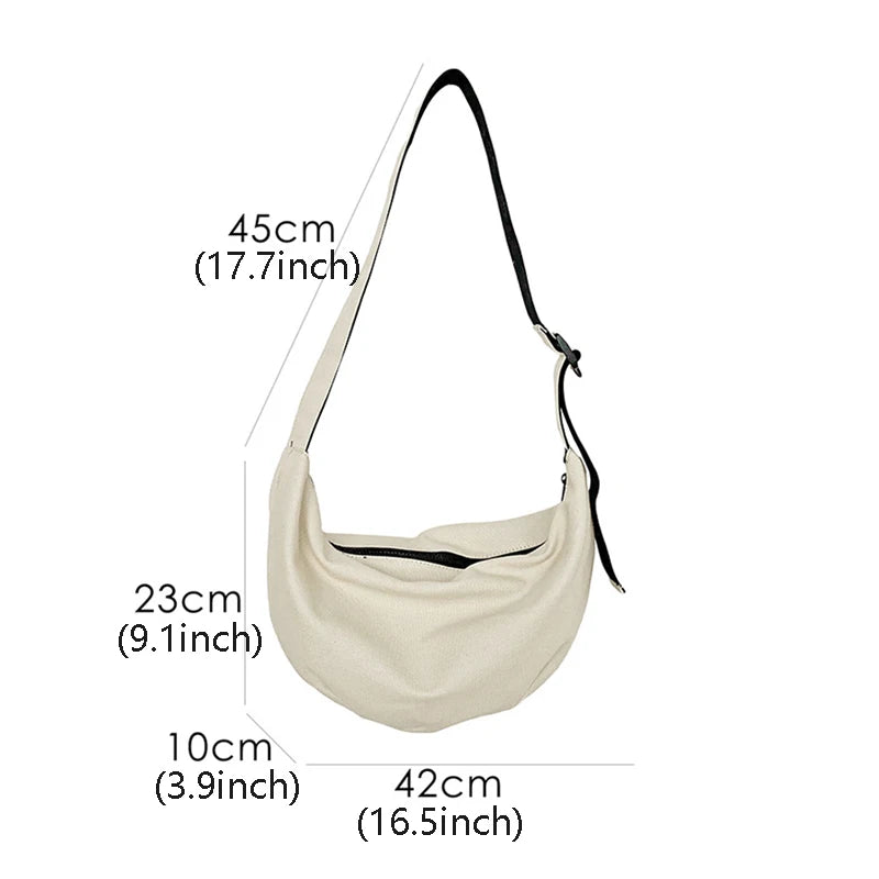 Stay stylish with this dumpling-shaped shoulder bag. Made of high-quality canvas, it offers ample space for all your essentials. Perfect for everyday use or travel.