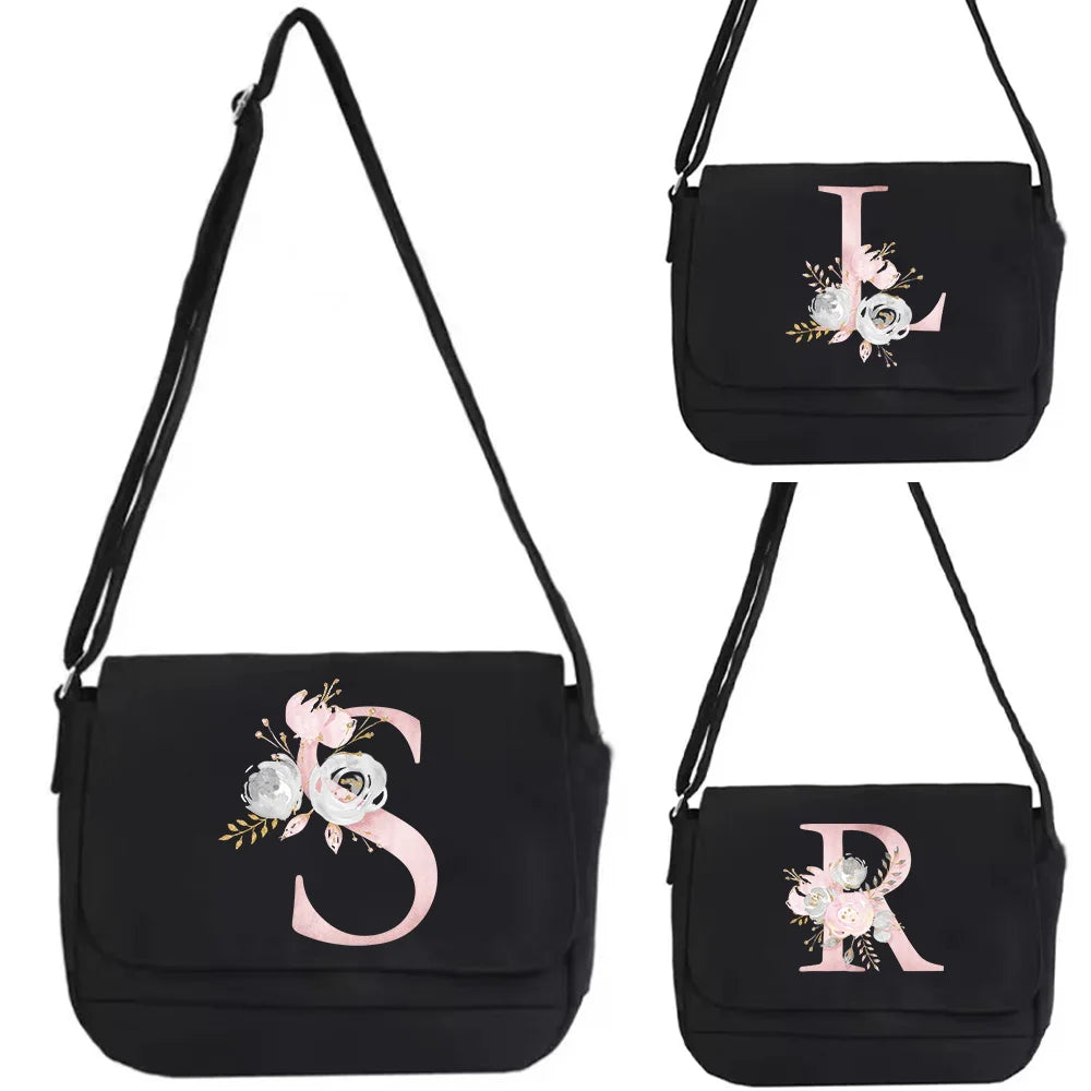 Canvas Messenger Travel Bag Pink Flower Initial Name Print