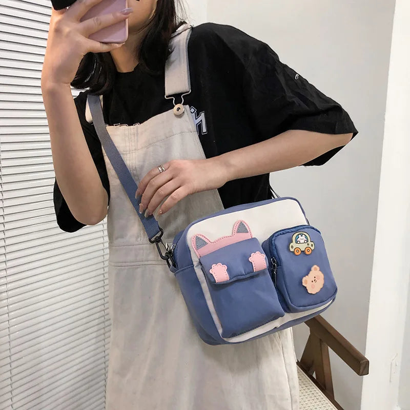 This women's canvas bag is a cute and compact accessory that is perfect for carrying your essentials. It features multiple pockets and a zipper closure. The cartoon design adds a fun touch to the bag.