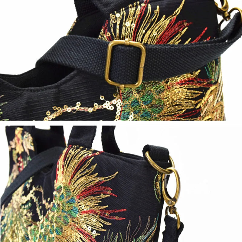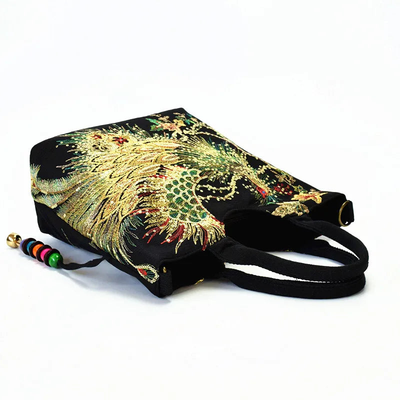This canvas handbag features a national phoenix embroidered design, making it perfect for leisure, beach outings, and travel. The adjustable shoulder strap allows for comfortable wear.