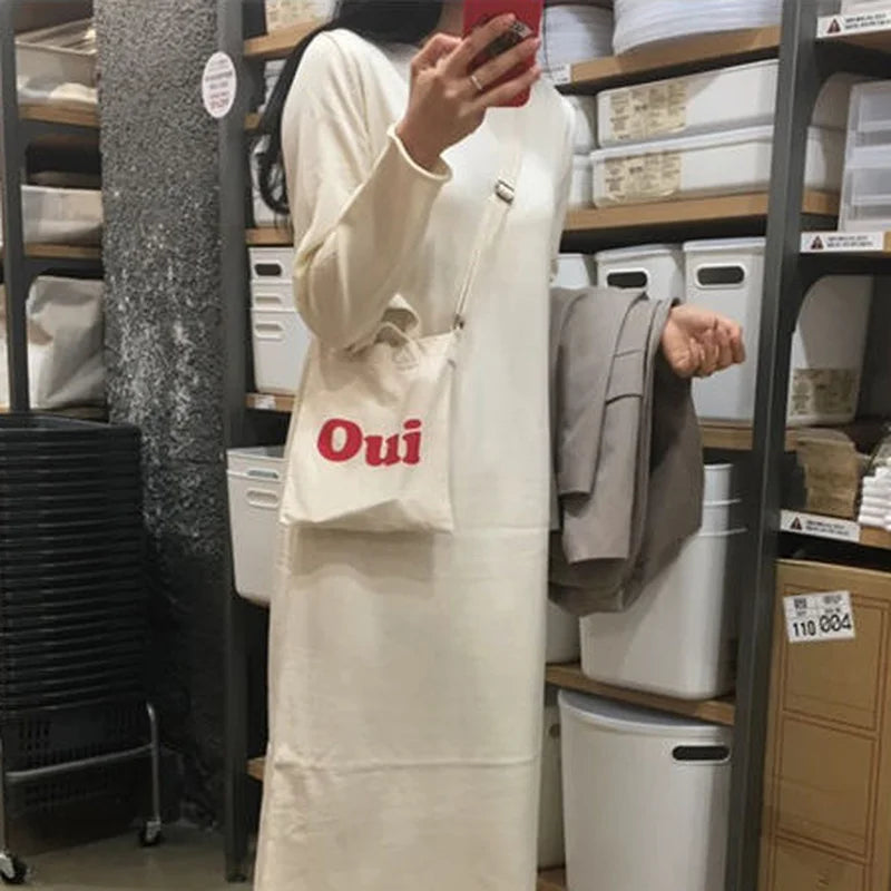 This canvas bag is the perfect accessory for women. It features a small printing design, shoulder strap, and hand-held option.