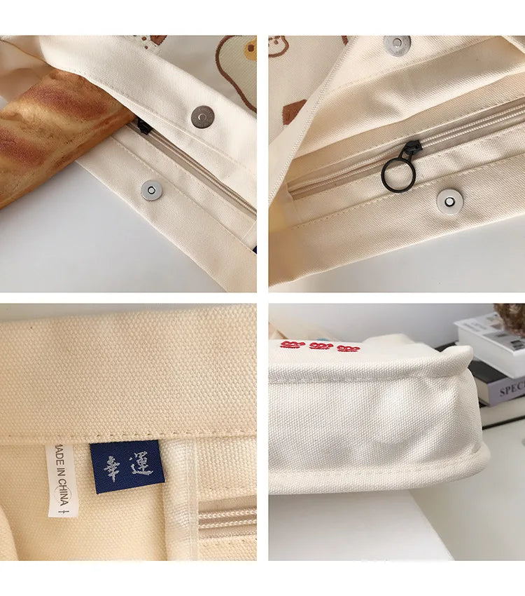 Stay stylish with this large capacity canvas bag featuring a cute bear design. Perfect for school, travel, and casual outings.