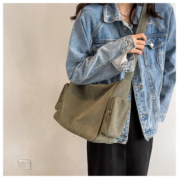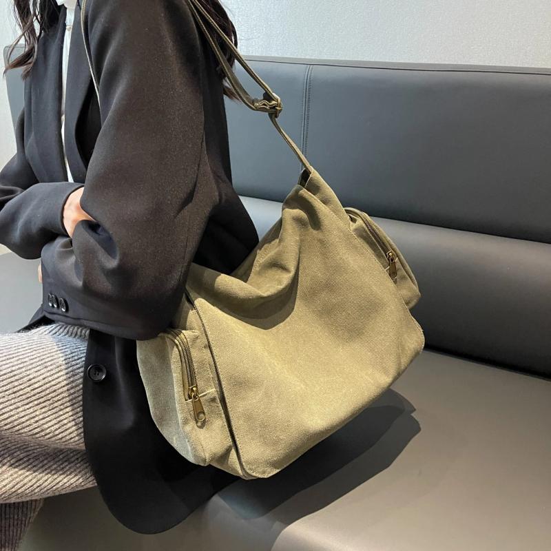 This versatile single shoulder bag is made of durable washed canvas, perfect for carrying your essentials in style. It features an adjustable strap for a comfortable fit and can be worn as a crossbody or a satchel.