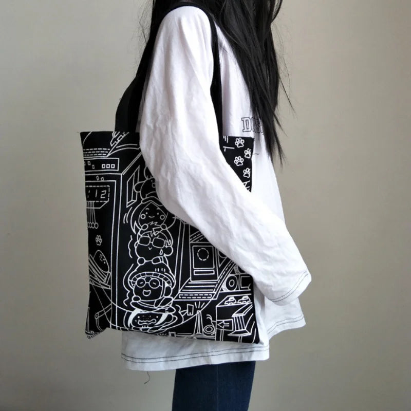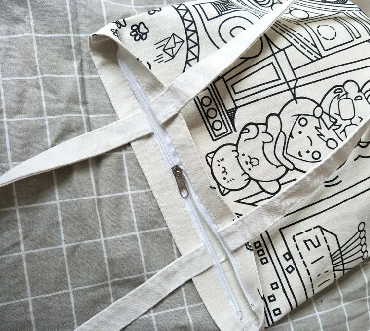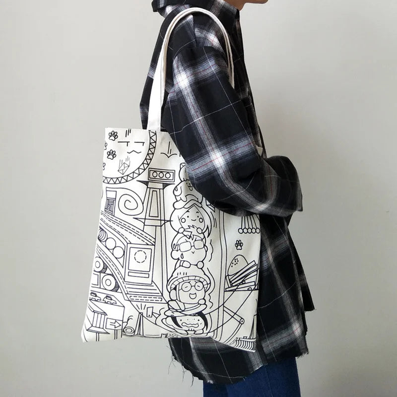 This canvas shoulder bag features cute cartoon and animal prints, perfect for school or casual outings. Made of eco-friendly cloth, it's a sustainable choice for your shopping needs.