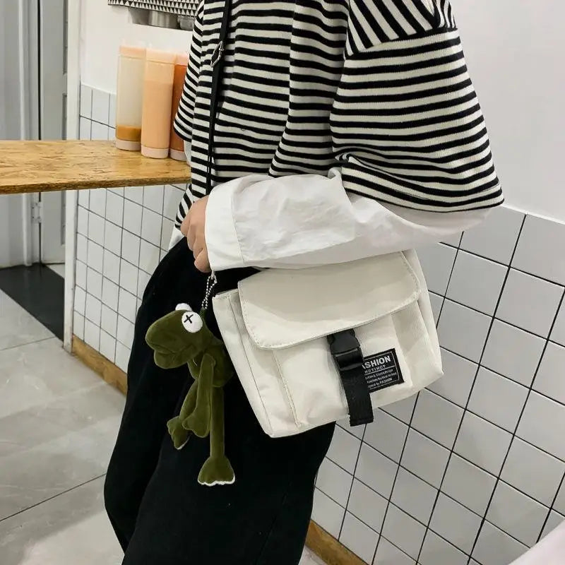 This stylish canvas bag is perfect for young women who love Japanese Harajuku fashion. It's a versatile accessory that can be worn as a crossbody or shoulder bag.