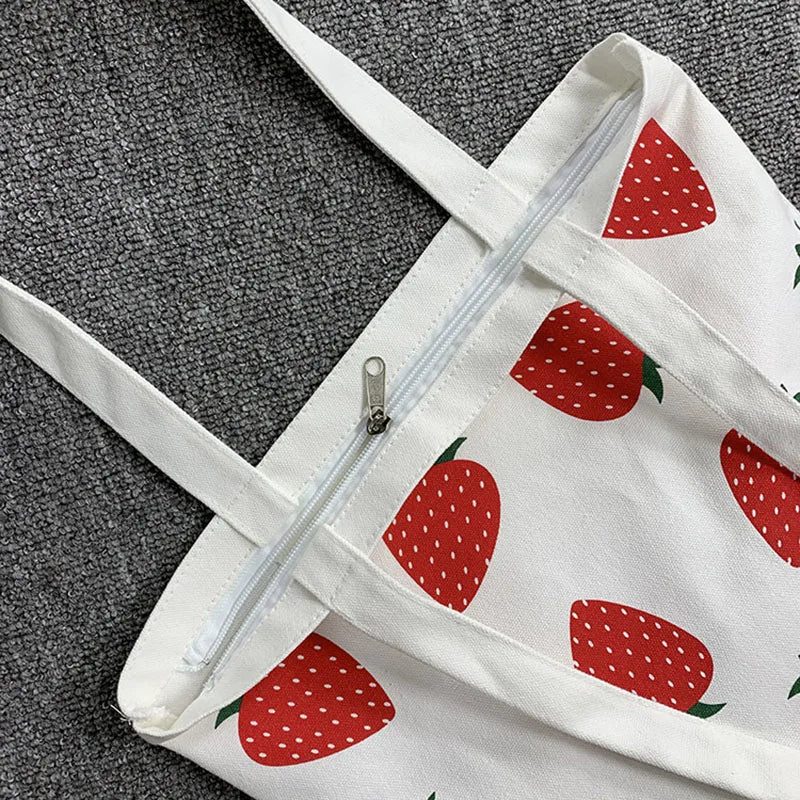 This canvas tote bag features a cute strawberry print, perfect for eco-friendly shopping. It's a large shoulder bag suitable for girls, female students, and anyone looking for a stylish and foldable handbag.