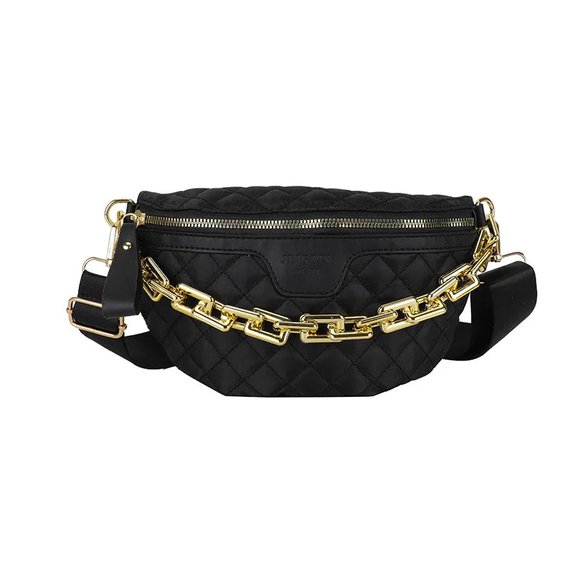 This women's canvas waist bag is perfect for casual outings. It can be worn as a fanny pack or a crossbody bag, providing versatile style and convenience. The chain adds a trendy touch to the design.
