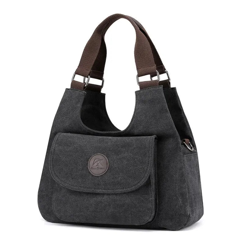 This versatile handbag is made of durable canvas, perfect for everyday use. It features a spacious main compartment and multiple pockets for organized storage.